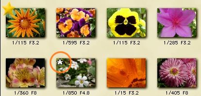 そこでクリックすると、さきほど同様に星形のチェックマークがついて、選択されたことを示します。 キーボードの M キーを押しても同じことができますので、矢印キーと M キーを使って一枚ずつ大きな画面で確認しながら選択してください。 |