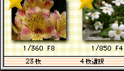 | 選択状態はウインドウを閉じても保存されます。 何枚選択されているかはウインドウ下端のステータスで確認できます。 この例では4枚選択されています。 なにも選択されていない場合、選択枚数の表示は消えます。 | ||||||||||||||||||||||||