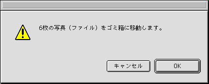| ゴミ箱に移動する前に確認のダイアログが出てきますので、必ず数を確認してください。 LEAFOの選択はファインダと異なりウインドウを閉じても保持されています。 以前に選択していたものも一緒に捨ててしまわないように注意して下さい。 |