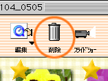 ゴミ箱ボタンを押すだけです。 コマンドキーを押しながらdeleteキーを押しても同じです。 写真はシステムのゴミ箱に捨てられますので、間違って捨てた場合にもファインダの操作で回収できます。(ゴミ箱の中から戻したいファイルを選択してファイルメニューから「片付ける」を選びます) |