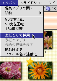 アルバムの中に入っている写真の中から表紙にしたいものをひとつ選択します。 アルバムメニューから表紙として採用を選びます。 |
