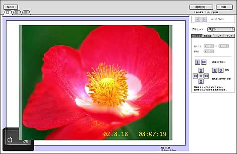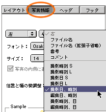 [写真情報]の[右]ポップアップメニューから、「撮影日、時刻」を選びます。 表示のフォント、サイズ、色を指定します。