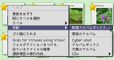 ←こんな風に、アルバムがいっぱいになっちゃったら、新しいアルバムボックスを作って整理しましょう。 移動したいアルバムを選択してコンテクストメニューを呼び出します(コントロールキーを押しながらサムネールをクリック)。